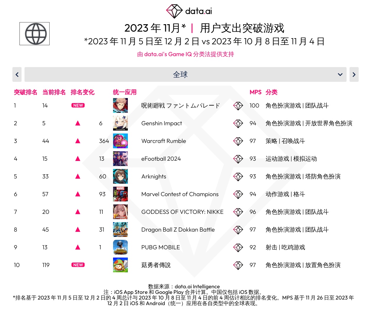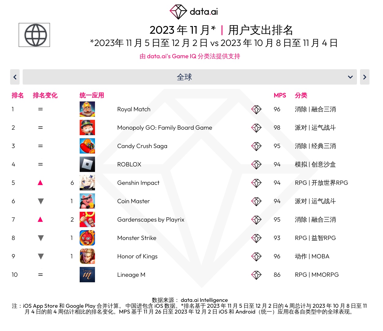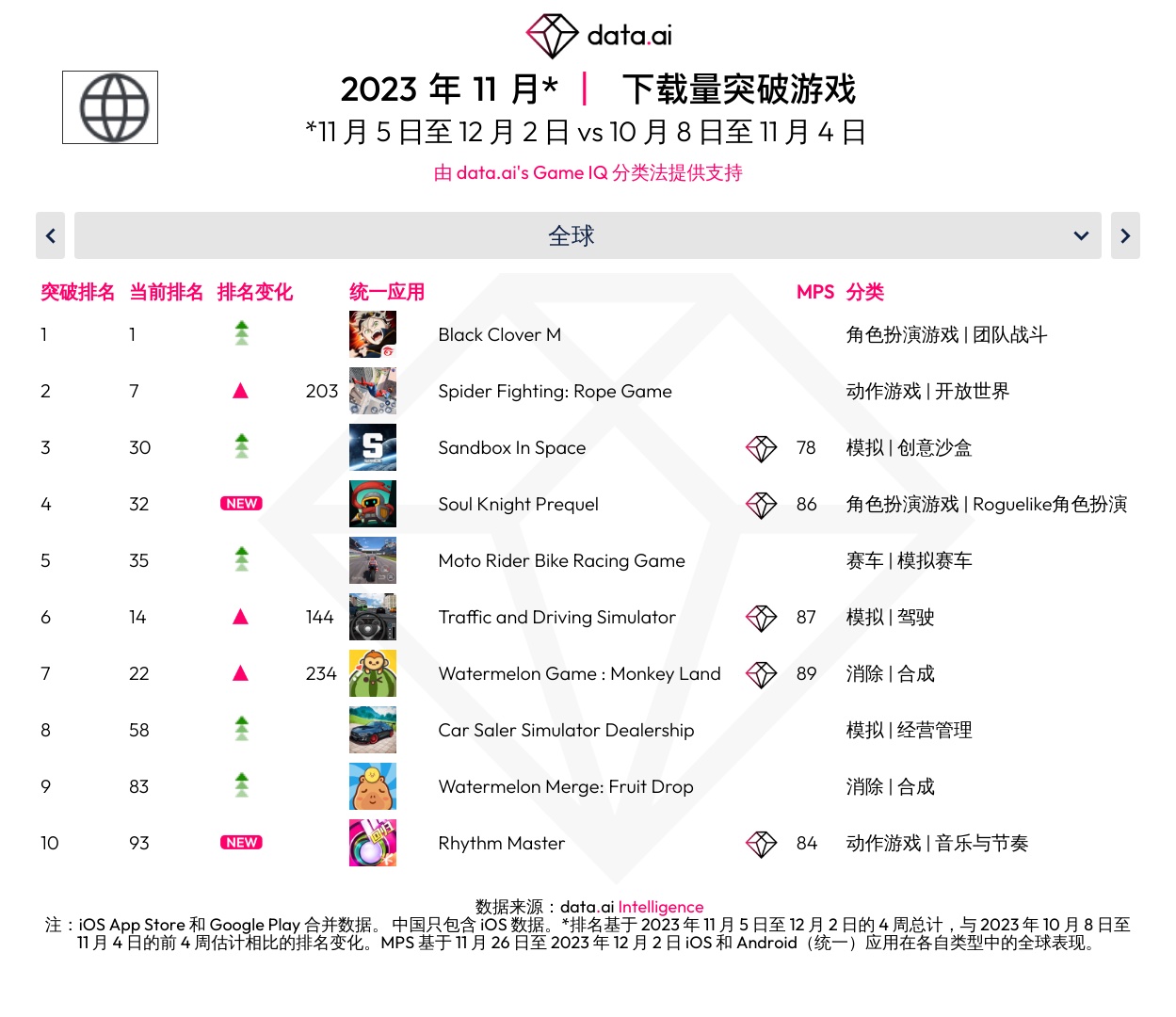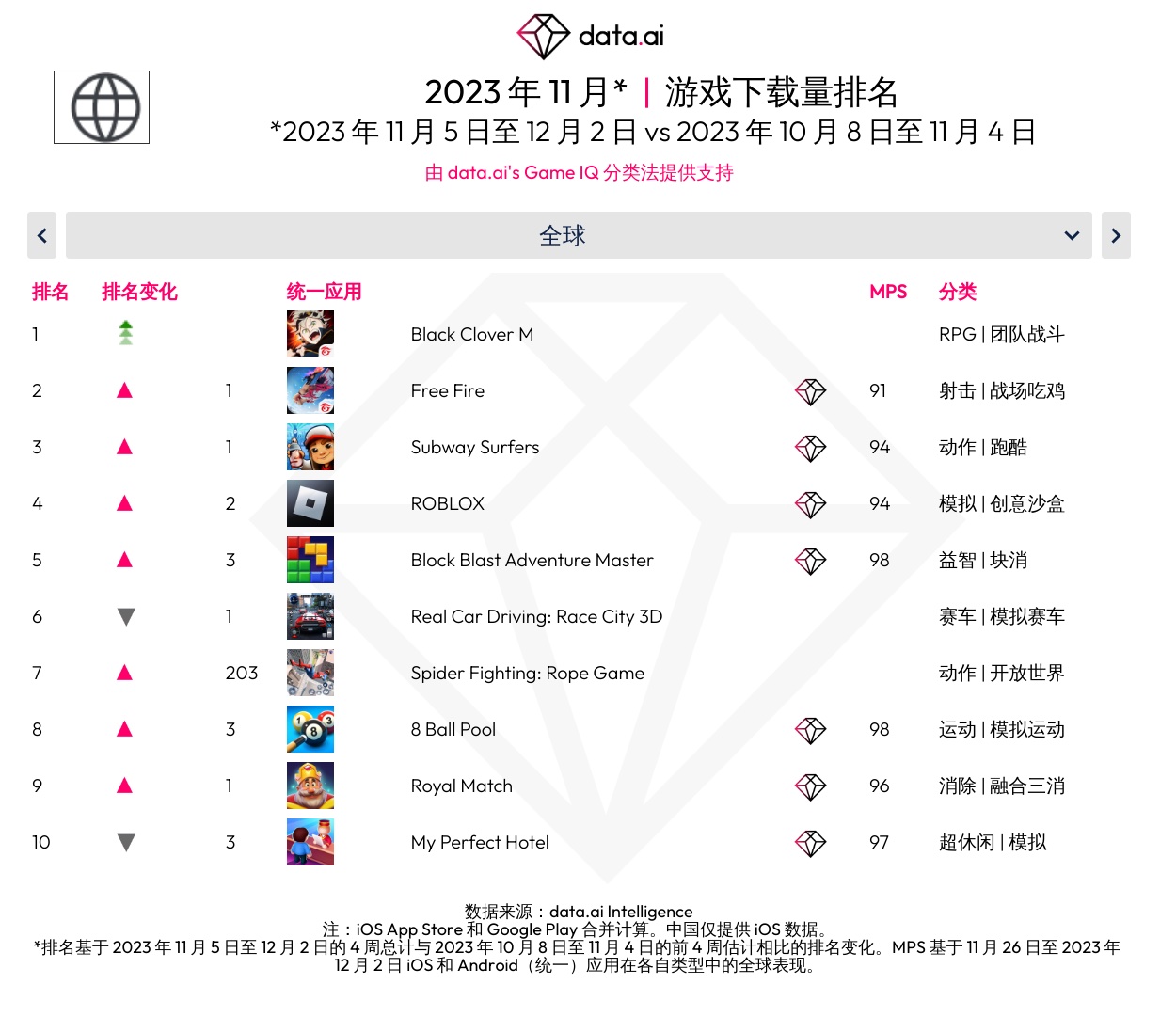 data.ai 发布了 2023 年 11 月全球打破游戏排行,以下为具体内容: